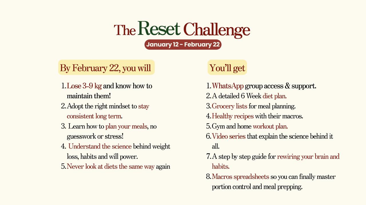 By February 22, you will lose 3-9 kg, and, more importantly, build the mindset and tools to stay consistent. You will master meal planning and finally understand how weight loss and habits truly work.